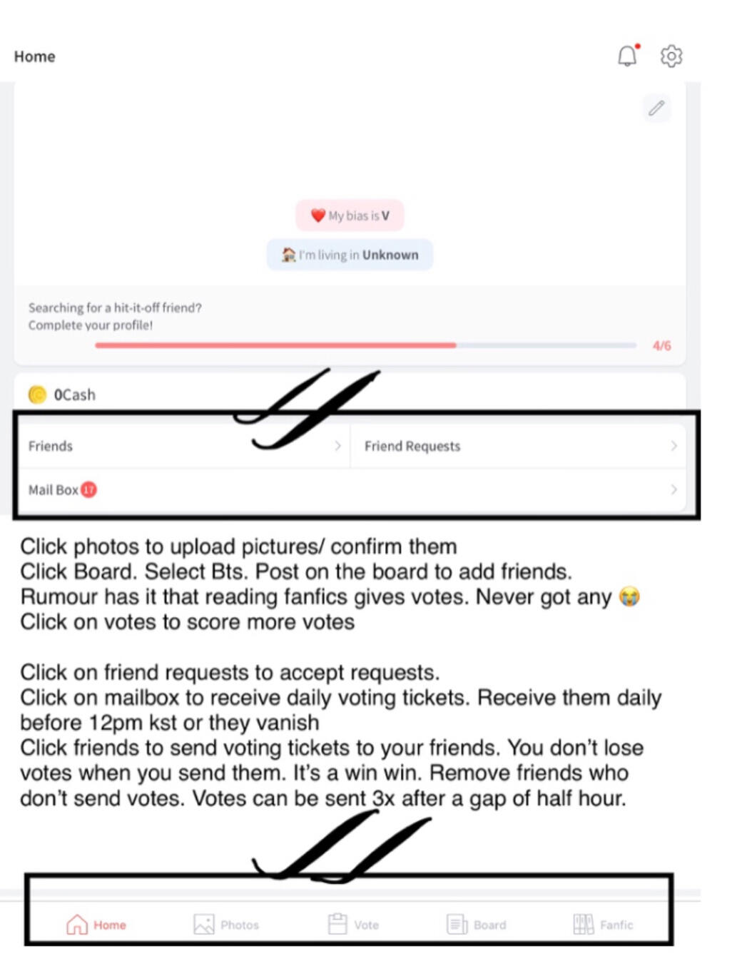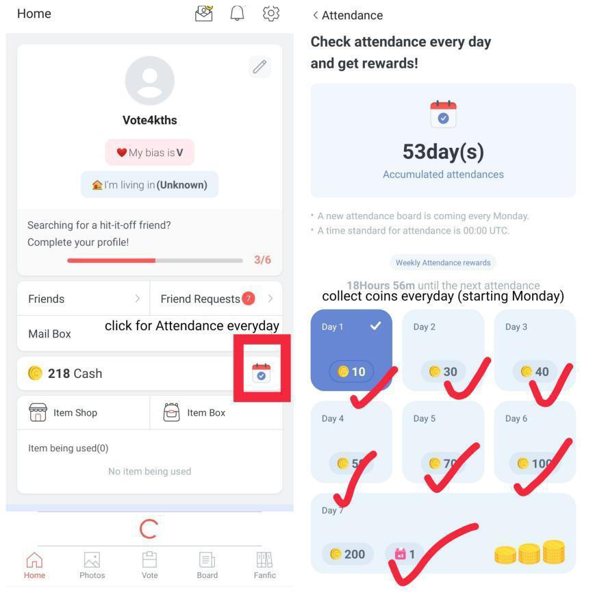 ✔ add 50 friends. Send votes to them thrice a day (More than 50 friends can be added by buying extension from items shop using coins)