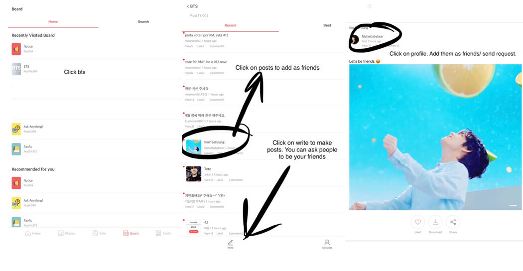 ✔click on post of tae stan. Tap their profile to add them as friend